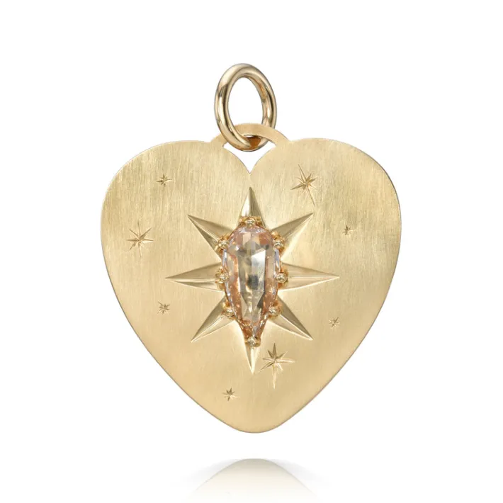 2.01ct U-V-Light Brown/SI1 GIA certified pear shaped diamond prong set in a handcrafted satin finished 18K yellow gold heart-shaped pendant.